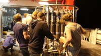 “We are collecting a hot and undiluted fluid sample. The hydrothermal system of Macauly showed pretty high concentrations of radium.”, said René excitedly. “We are also sampling the water column at different distances from the hydrothermal vents and we can see that the radium concentration decreases with distance. The reason is firstly that the hydrothermal fluid gets quickly diluted, and secondly the radioactive decay of the radium. As we are know the speed of decay, it is possible to calculate the age of the samples. Finally, we hope to be able to say that ‘to travel a distance of 500 meters, the hydrothermal fluids need a certain amount of time’. With that, we won´t just know the age of the sample, we will also know the transport velocity of the hydrothermal fluids,” he continues.